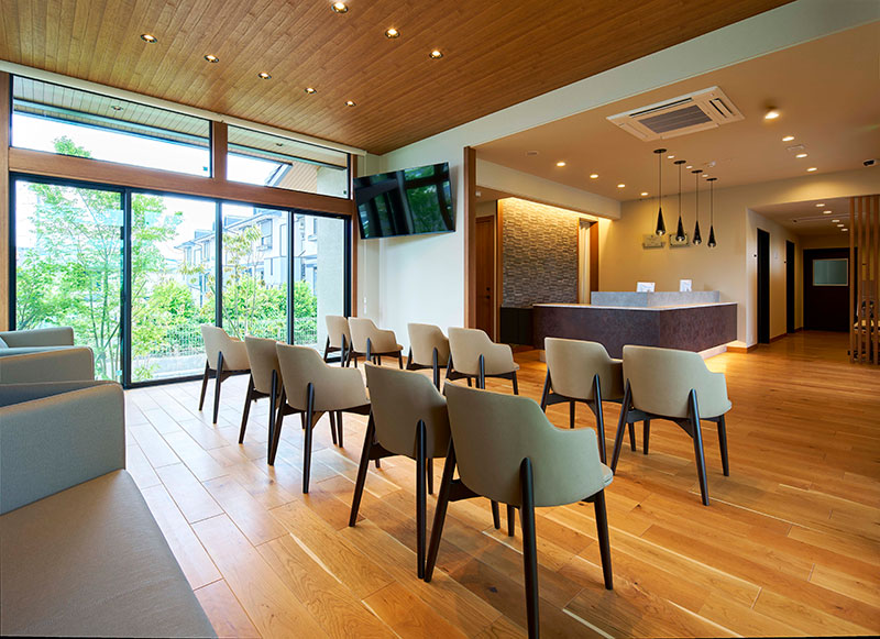 待合室は広々とした空間を木目調の壁と床で包み込んだ温もりあふれる空間にしております。