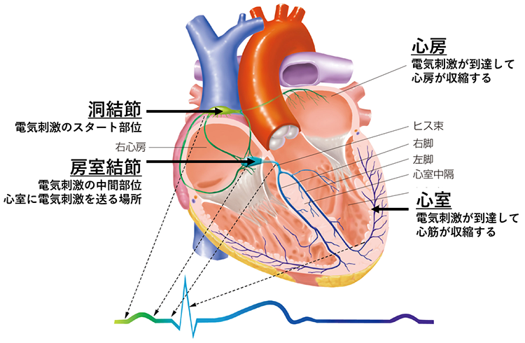 心臓は電気信号の刺激で、心臓の筋肉(心筋)が収縮して血液を送り出します。