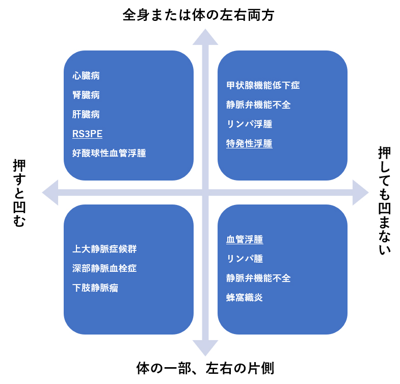 病気によるむくみとそれ以外があり、むくむ場所によって、大きく2つに分かれます。