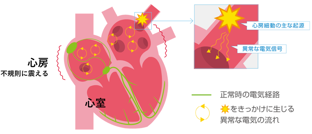 心房細動とは、心房が異常な電気信号の刺激によって、痙攣(けいれん)したように不規則に細かく震えている状態を言います。