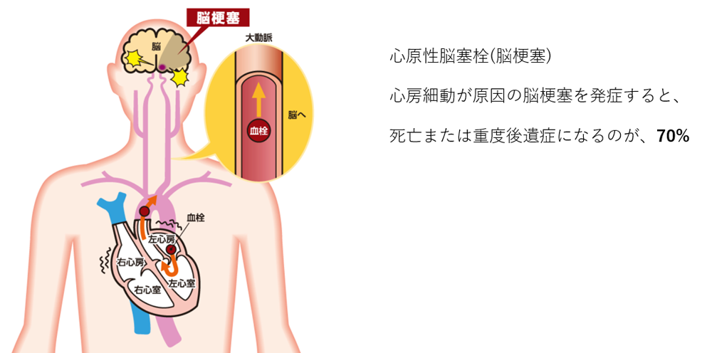 心房細動が原因の脳梗塞を発症すると、死亡または重度後遺症を残す割合が70%とされています。